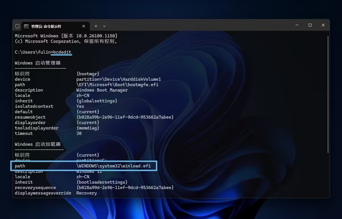 2. bcdedit بۇيرۇقىنى ئىجرا قىلىپ، «Path» يولىغا قاراڭ: